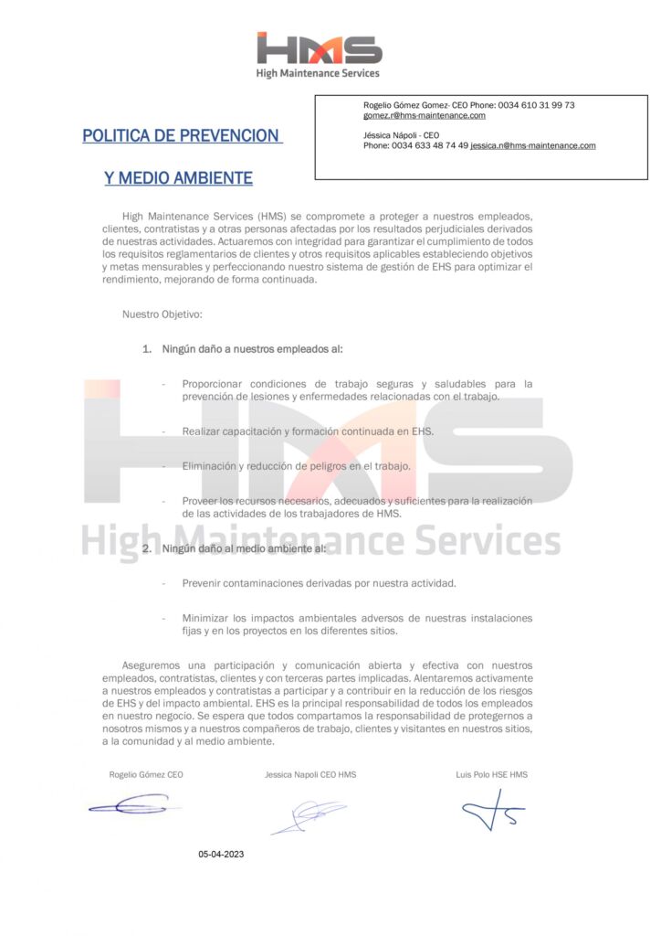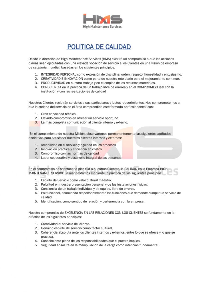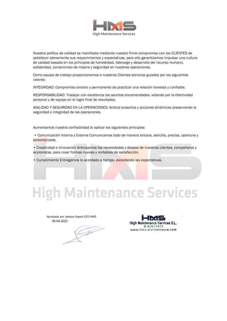 A fin de orientar la actuación de todos los que tienen responsabilidades de gestión en la compañía, sean estos miembros de la alta Dirección o mandos directos, la dirección de HIGH MAINTENANCE SERVICES adopta la presente Política que tiene su expresión en los siguientes principios:
